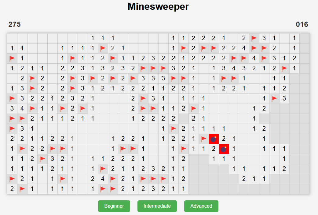 Advanced는 30 x 16 칸에서 99개의 지뢰를 찾아야 한다. (해보니 지뢰가 너무 많은 것 같아 75개로 줄였다)