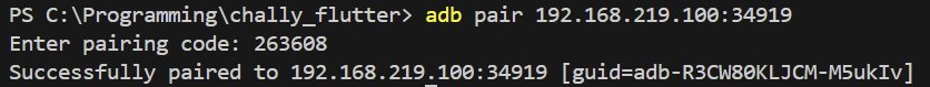 adb pair <IP주소>:<포트>를 입력한다. 바로 위에서 확인한 페어링을 위한 IP 주소와 포트를 넣으면 된다.