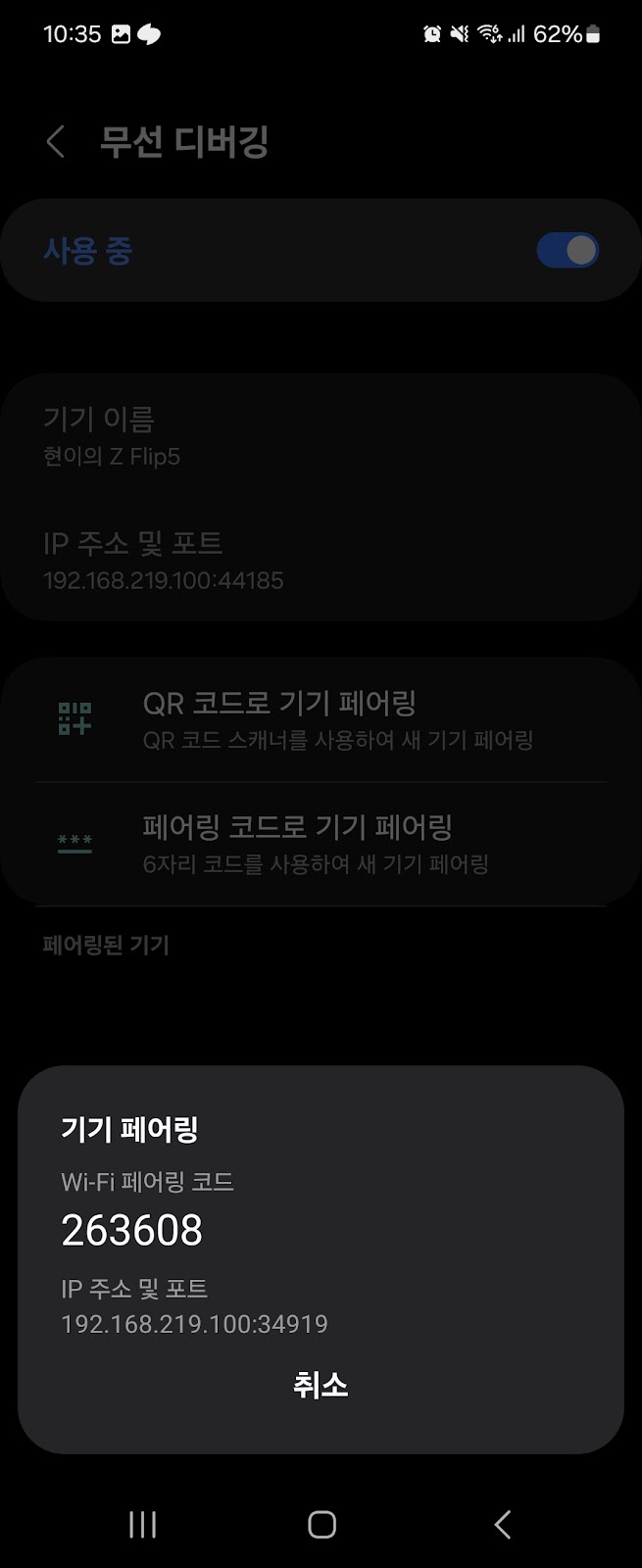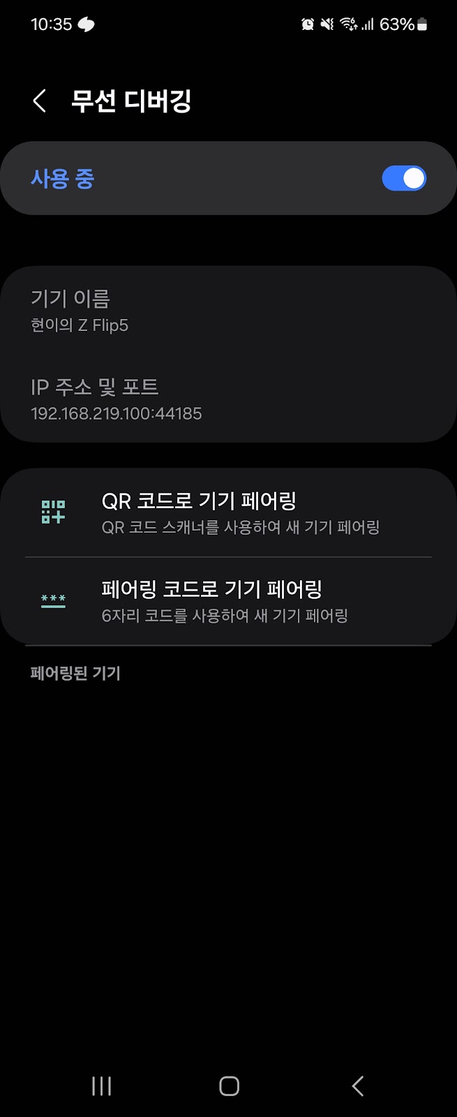 페어링에 사용했던 포트와 달리, 여기에 들어가는 정보는 무선 디버깅 화면에 표시된 기기 정보이다.