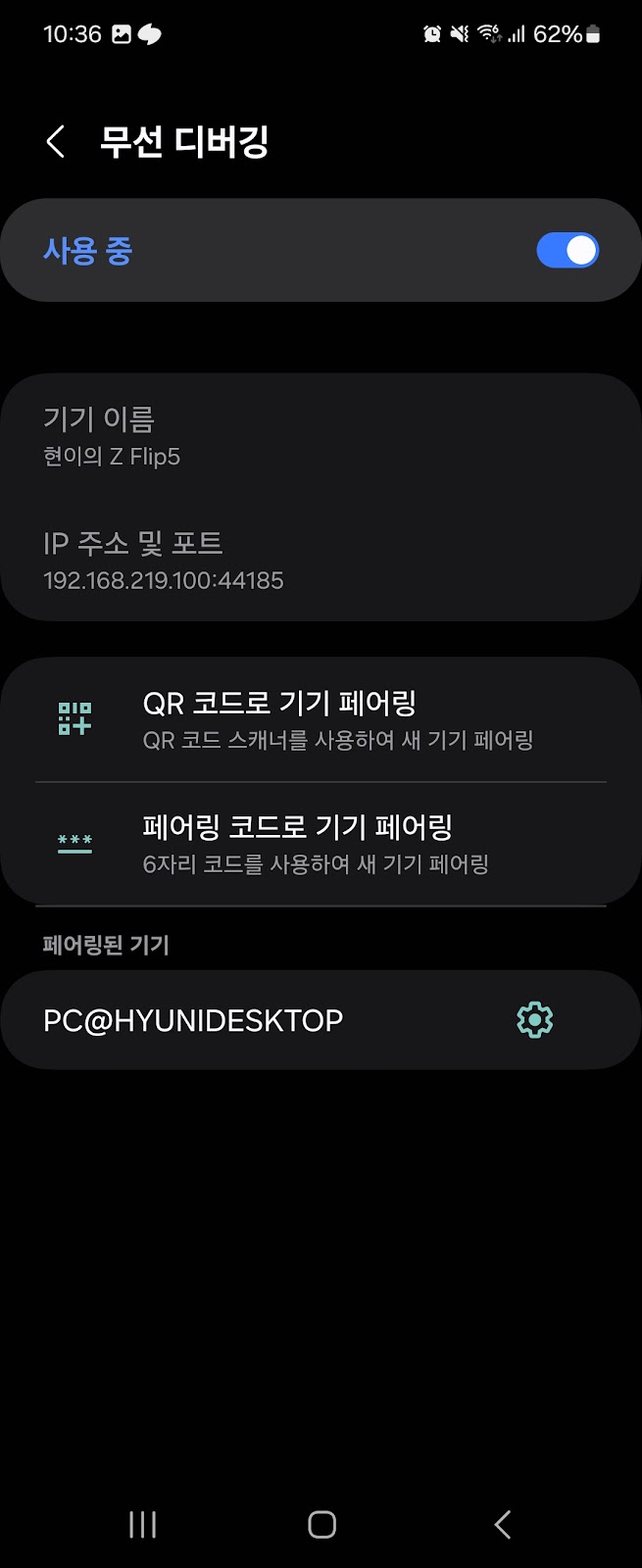adb connect <IP주소>:<포트> 명령으로 할 수 있다. 페어링에 사용했던 포트와 달리, 여기에 들어가는 정보는 무선 디버깅 화면에 표시된 기기 정보이다.